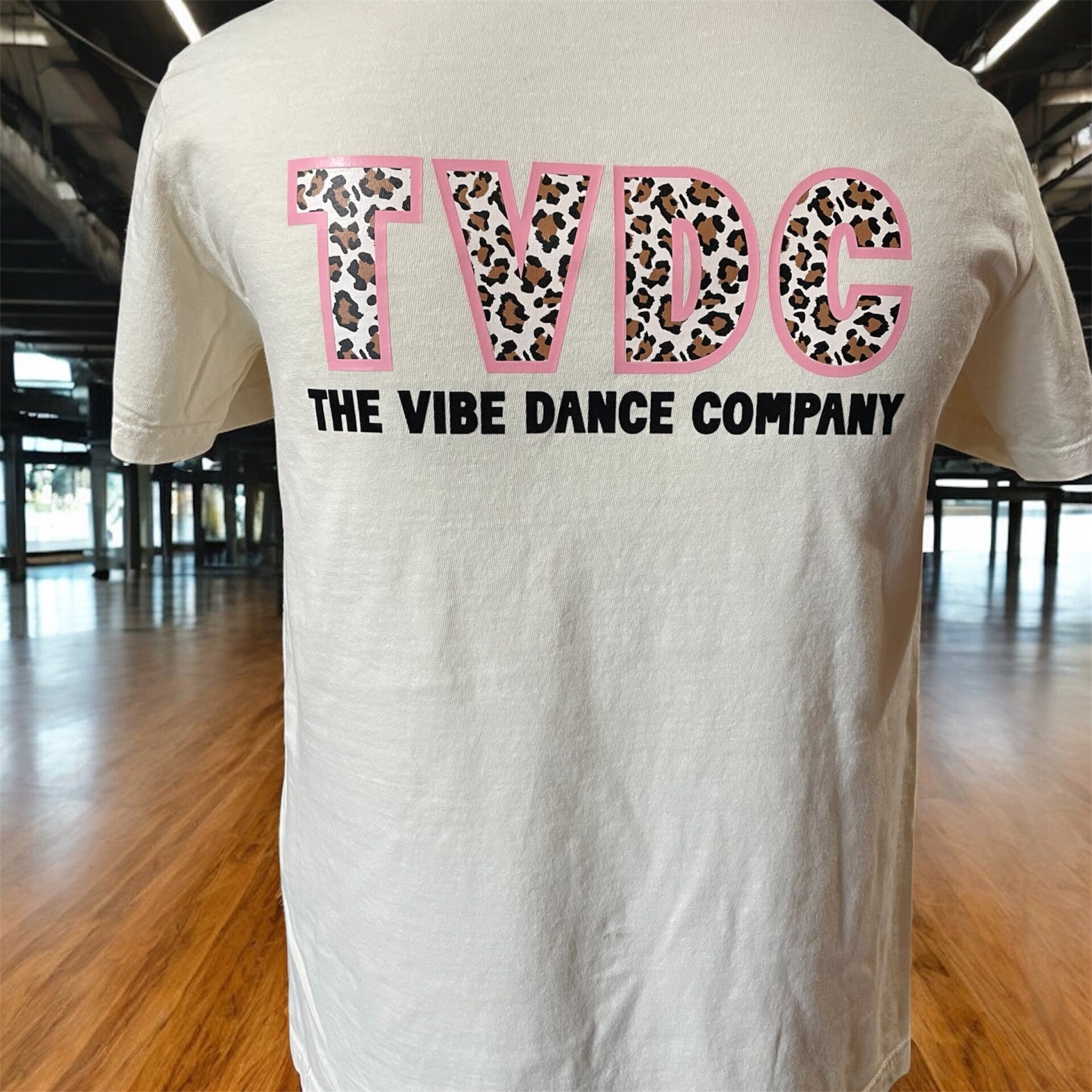 ADULT CREAM T-SHIRT WITH "be the vibe." EMBROIDERED ON THE FRONT IN PINK, THE BACK IS TAN CHEETAH OUTLINED IN PINK WITH BLACK FUZZY "THE VIBE DANCE COMPANY" AVAILABLE IN ADULT S-4XL